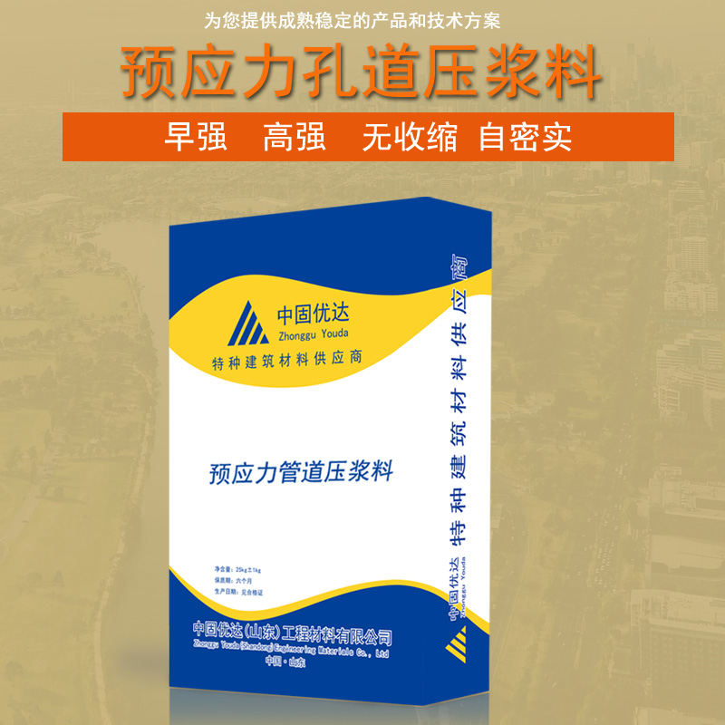 預應力管道壓漿料簡稱壓漿料,是由優(yōu)質水泥基材料、減水劑、微膨脹劑、礦物摻合料配制而成,具有良好的流動性,不泌水,不離析,無收縮、微膨脹,強度高,抗?jié)B抗凍、抗腐蝕、粘接度高、綠色環(huán)保等特點,不含氧化物、氯化物、亞硫酸鹽和亞硝酸鹽等對鋼筋有害組份,產(chǎn)品廣泛應用于鐵路橋梁、公路橋梁、核電站等大型工程的預應力結構孔道灌漿的施工;各種砼結構接頭處止漏灌漿;空隙填補或修復;地面錨固壓漿、設備基礎壓漿、底板注漿、梁柱節(jié)點、工程搶修等用途。